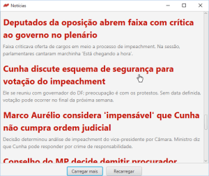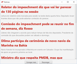 Um programa que pega os títulos e descrições das notícias da página de política do G1. Ao clicar em uma notícia, uma página no navegador é aberta. Feito em Java utilizando JavaFX e JSoup, em maio de 2016.
